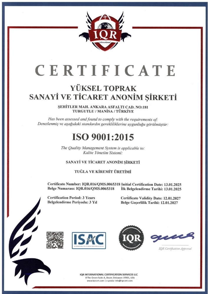 TS EN ISO 9001:2015 Tuğla ve Kiremit Üretimi